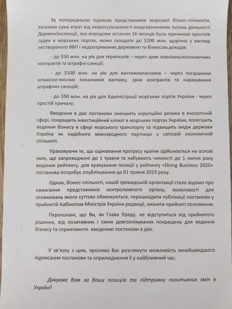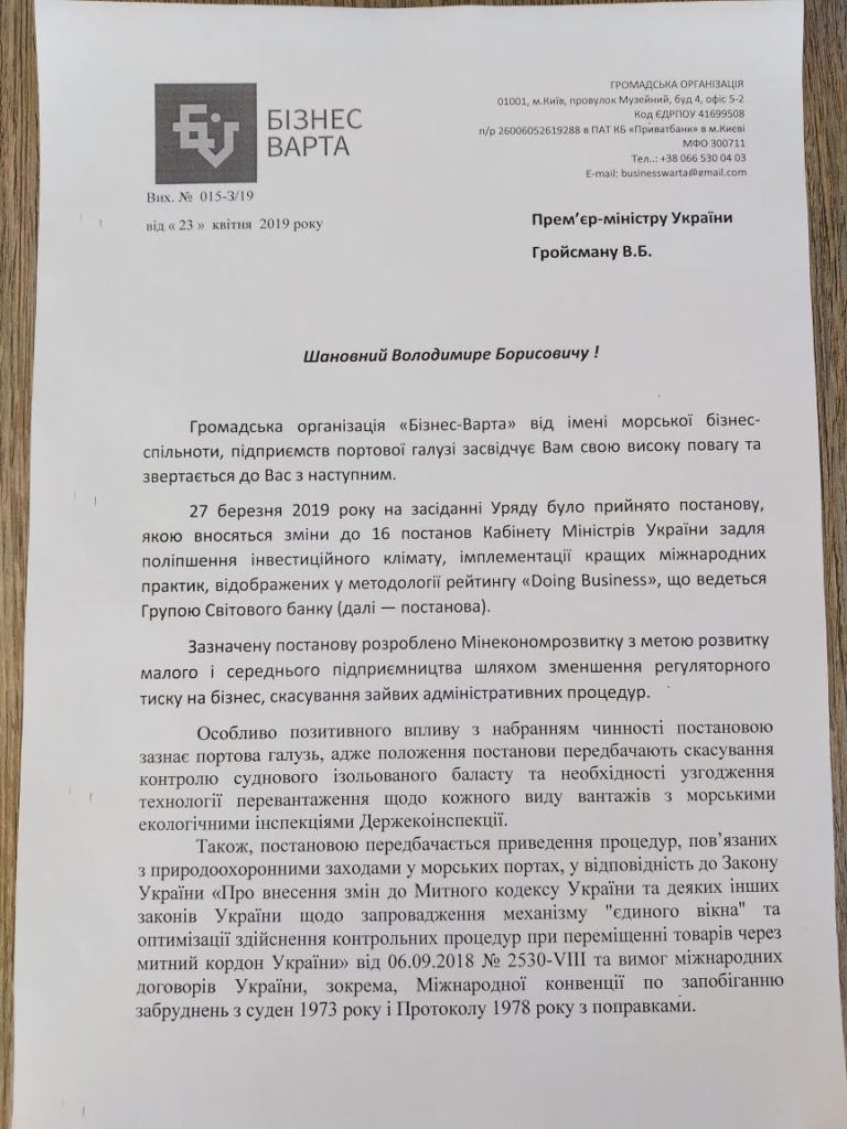 Бізнес висловлює подяку Кабінету Міністрів за прийняття 27 березня 2019 року постанови «Деякі питання дерегуляції господарської діяльності» і просить невідкладно її підписати та опублікувати.