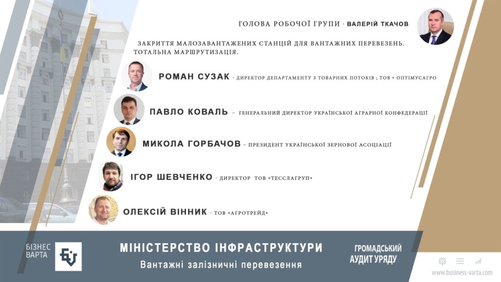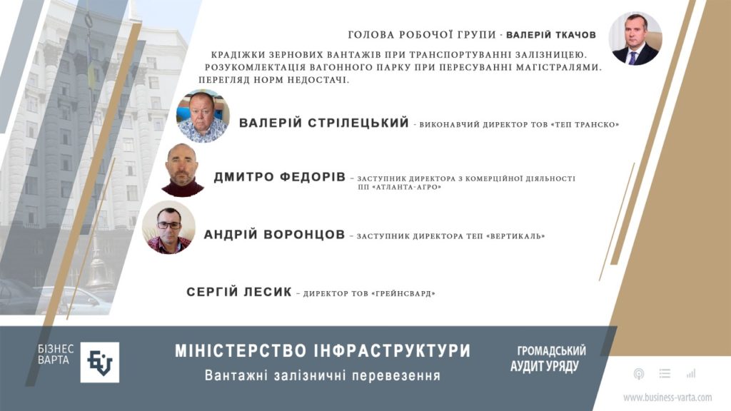 Представляємо вам учасників робочої групи «Вантажні залізничні перевезення». У рамках ініціативи «Громадський аудит Уряду» спеціалісти від бізнесу визначили нагальні проблеми Укрзалізниці та активно вже напрацьовують шляхи їхнього подолання, які будуть представлені 10 липня на Форумі «Бізнес проти знищення держави. Аналіз проблем. Висновки. План дій».