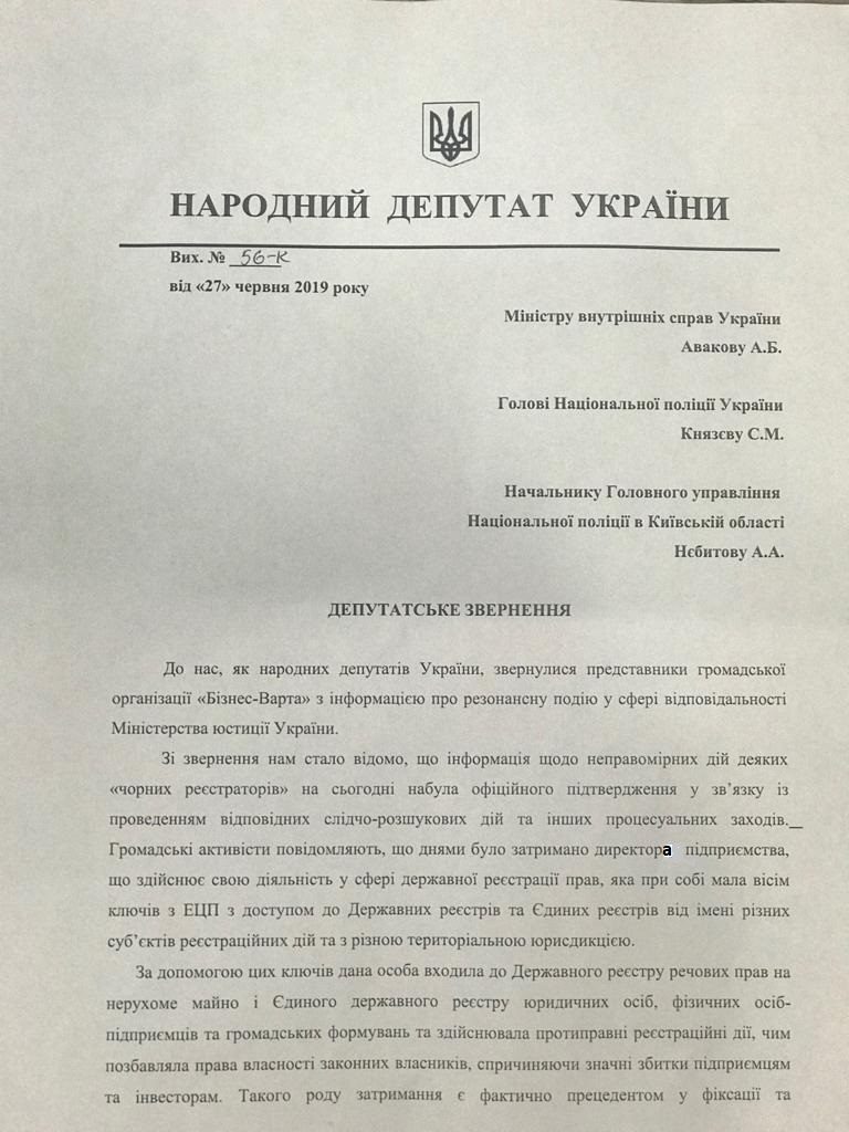 Народні депутати, члени Міжфракційного депутатського об’єднання «Бізнес-Варта» звертаються до Міністра внутрішніх справ Арсенія Авакова, Голови Національної поліції України Сергія Князєва та до т.в.о. Начальника головного управління поліції в Київській області Андрія Нєбитова з проханням вжити заходи задля швидкого та ефективного розслідування кримінального провадження, пов’язаного із затриманням ряду посадових осіб різних комунальних підприємств, акредитованих Мін’юстом на здійснення діяльності у сфері реєстрації прав та бізнесу. Цих осіб підозрюють у несанкціонованому втручанні до реєстрів, що призвело до втрати права власності на майно та активи третіх осіб.
