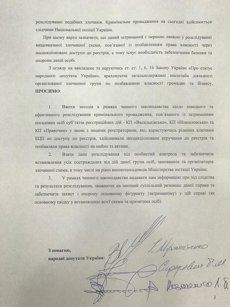 Відтак, народні депутати наполягають, щоб очільники правоохоронних відомств забезпечили встановлення усіх замовників та організаторів злочинної схеми, в тому числі на рівні високопосадовців Міністерства юстиції України.