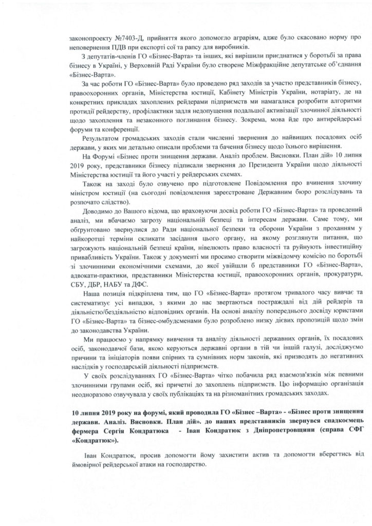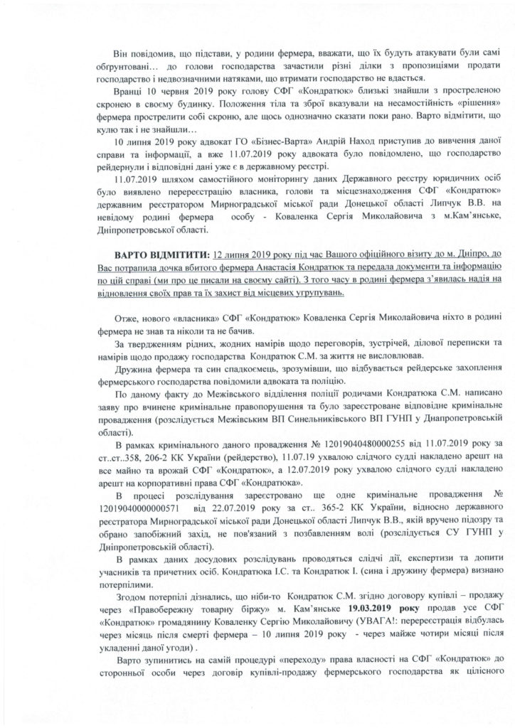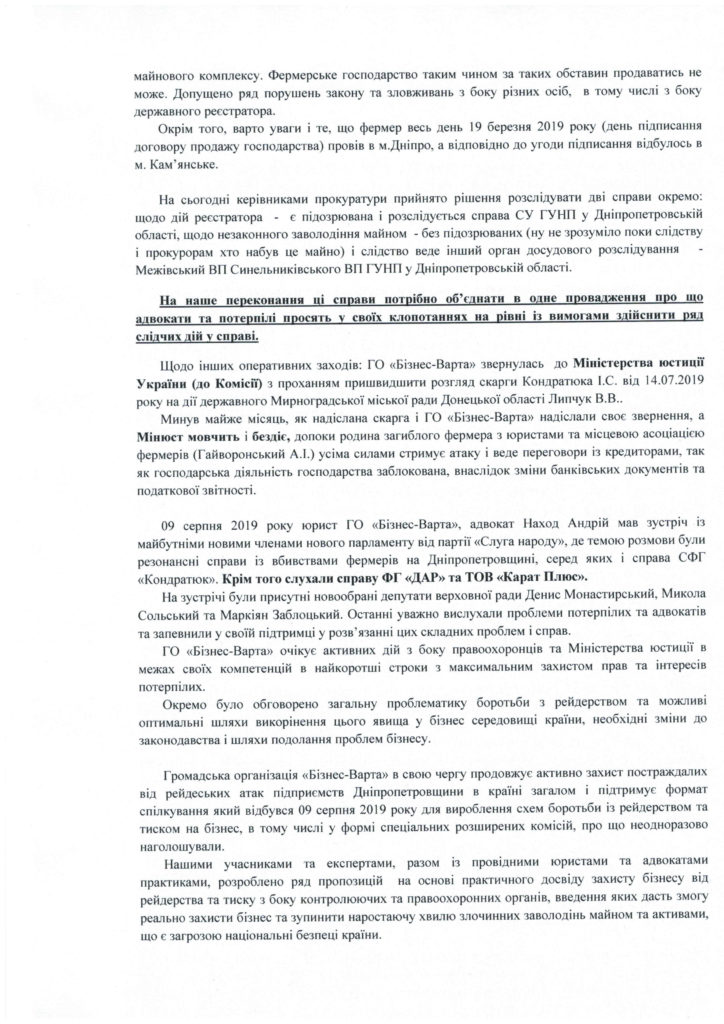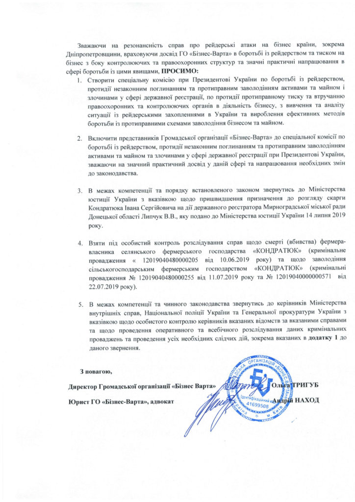 Після зустрічі юриста «Бізнес-Варти» Андрія Находа з майбутніми головами аграрного та правоохоронного комітетів Верховної Ради: Миколою Сольским та Денисом Монастирським, а також майбутнім нардепом Мар’яном Заблоцьким, ми підготували звернення до Президента України, де докладно виклали усі відомі на сьогодні нюанси рейдерського захоплення СФГ «Кондратюка» та загибелі його власника.