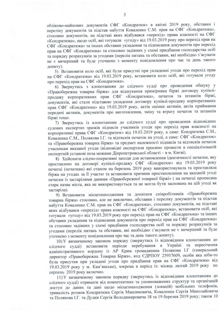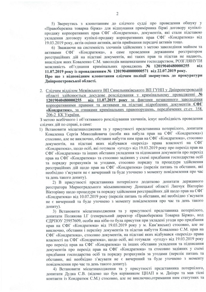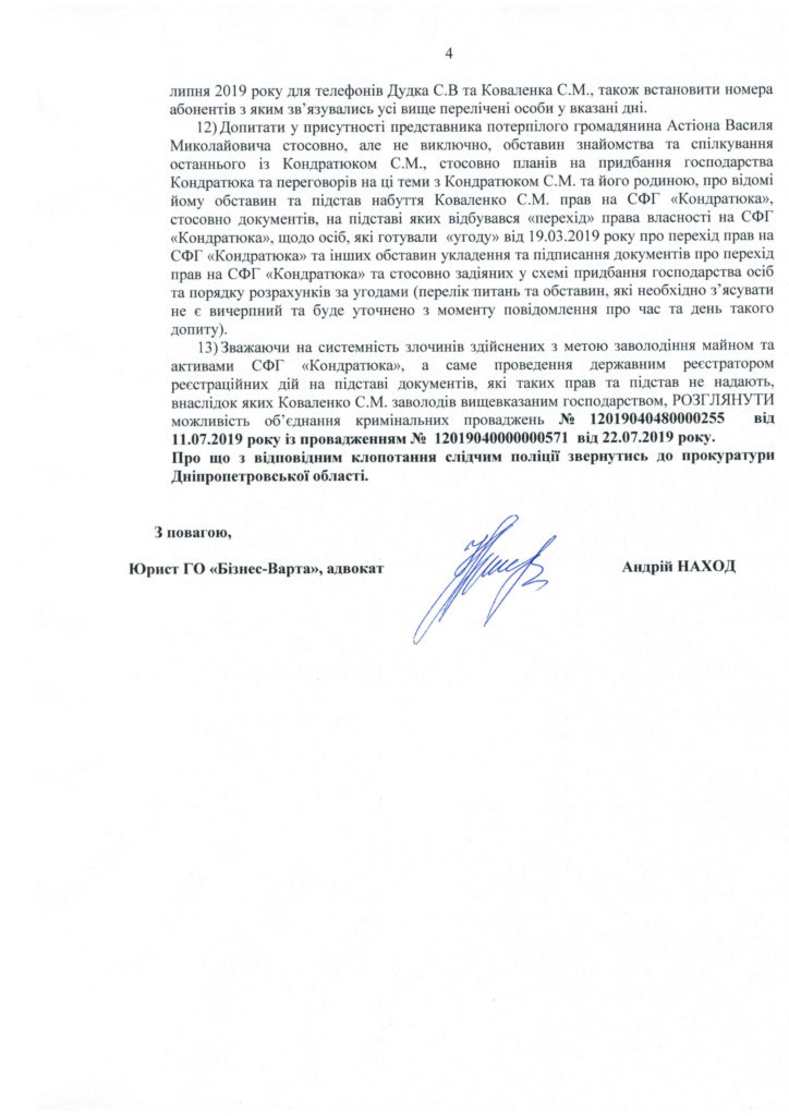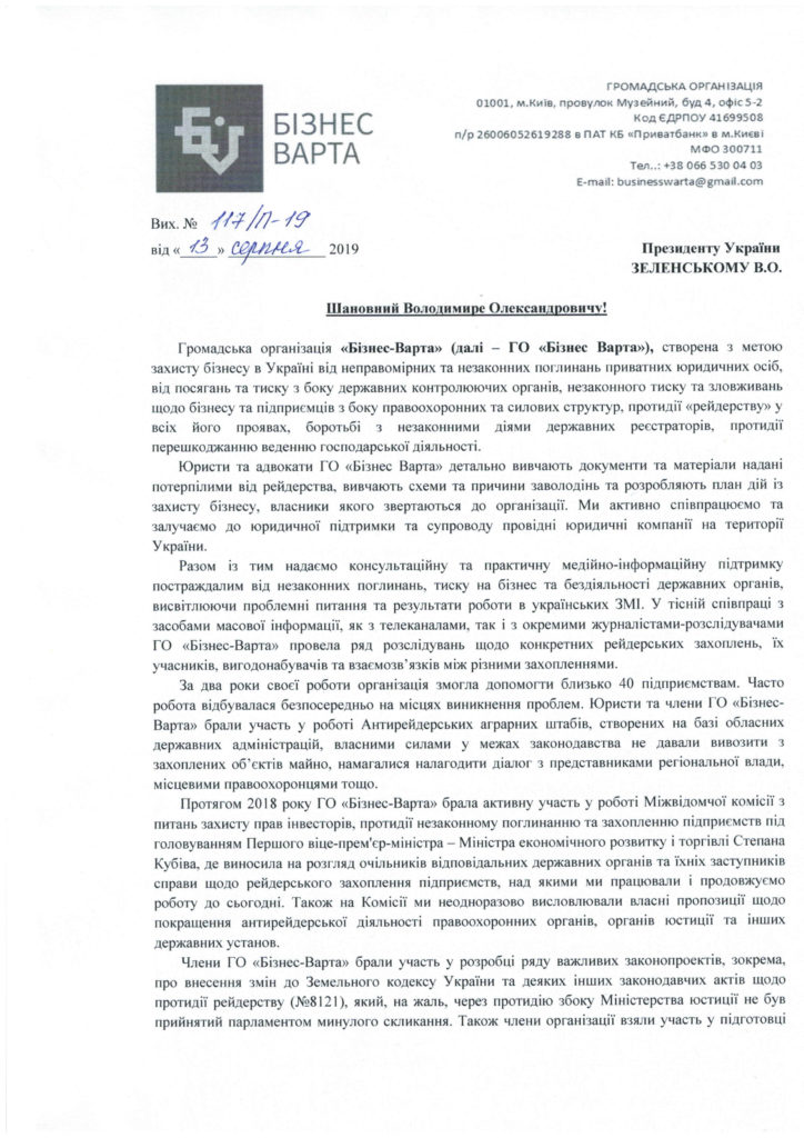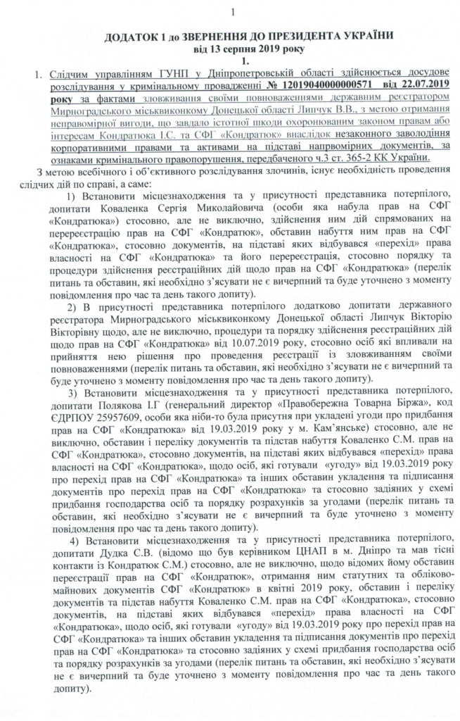 Після зустрічі юриста «Бізнес-Варти» Андрія Находа з майбутніми головами аграрного та правоохоронного комітетів Верховної Ради: Миколою Сольским та Денисом Монастирським, а також майбутнім нардепом Мар’яном Заблоцьким, ми підготували звернення до Президента України, де докладно виклали усі відомі на сьогодні нюанси рейдерського захоплення СФГ «Кондратюка» та загибелі його власника.